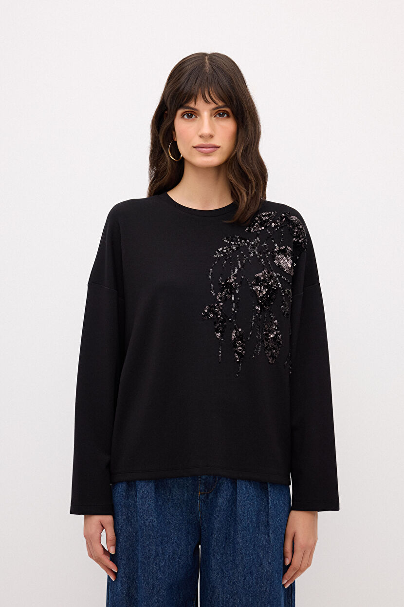 Siyah Pul Payet Nakışlı Sweatshirt