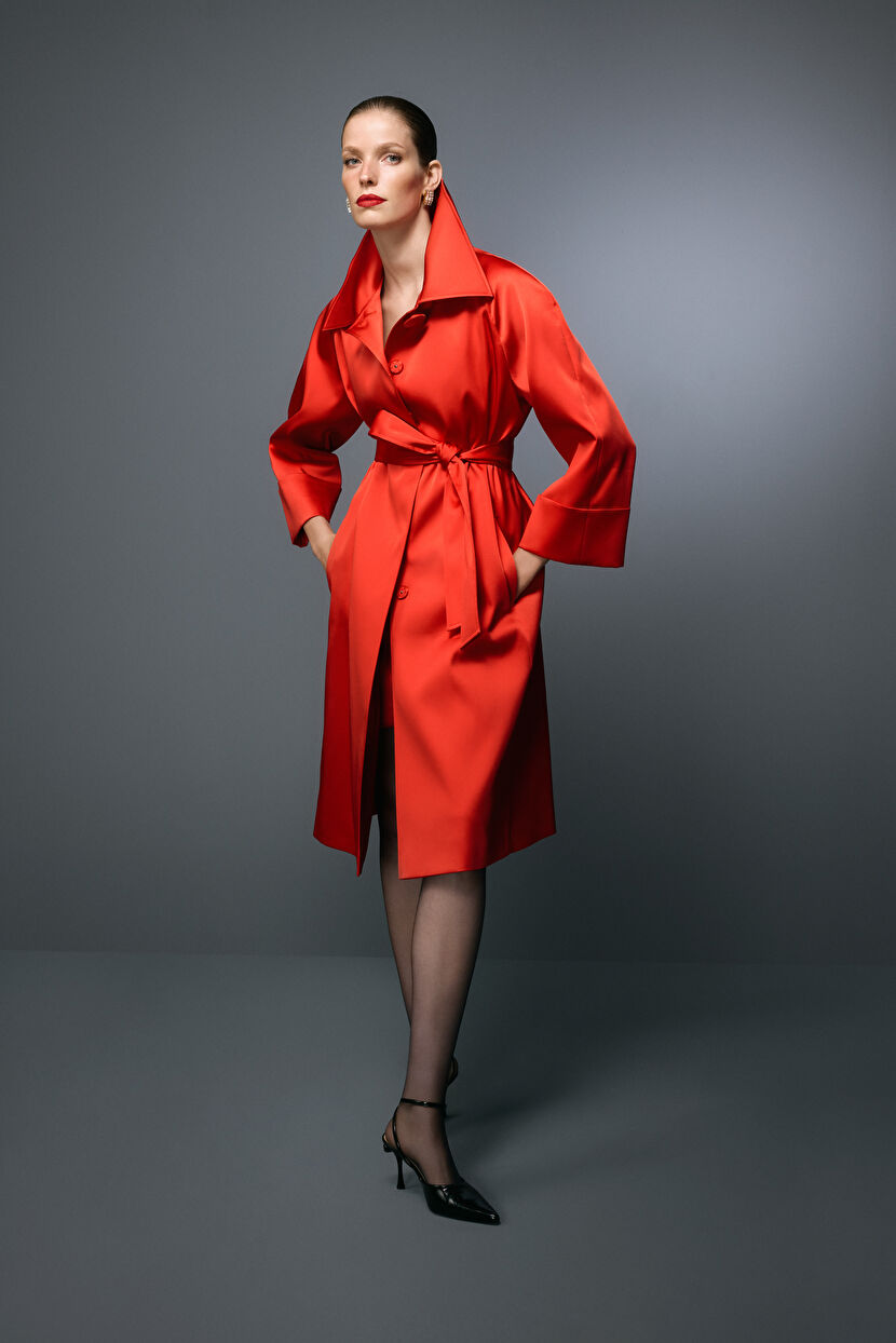 Kırmızı Mert Aslan Kuşaklı Saten Trenchcoat