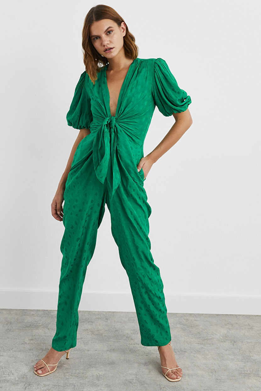 Yeşil Önden Bağcıklı Balon Kollu Tulum
