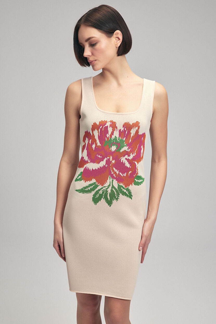 Bej Çicek Desenli Triko Elbise