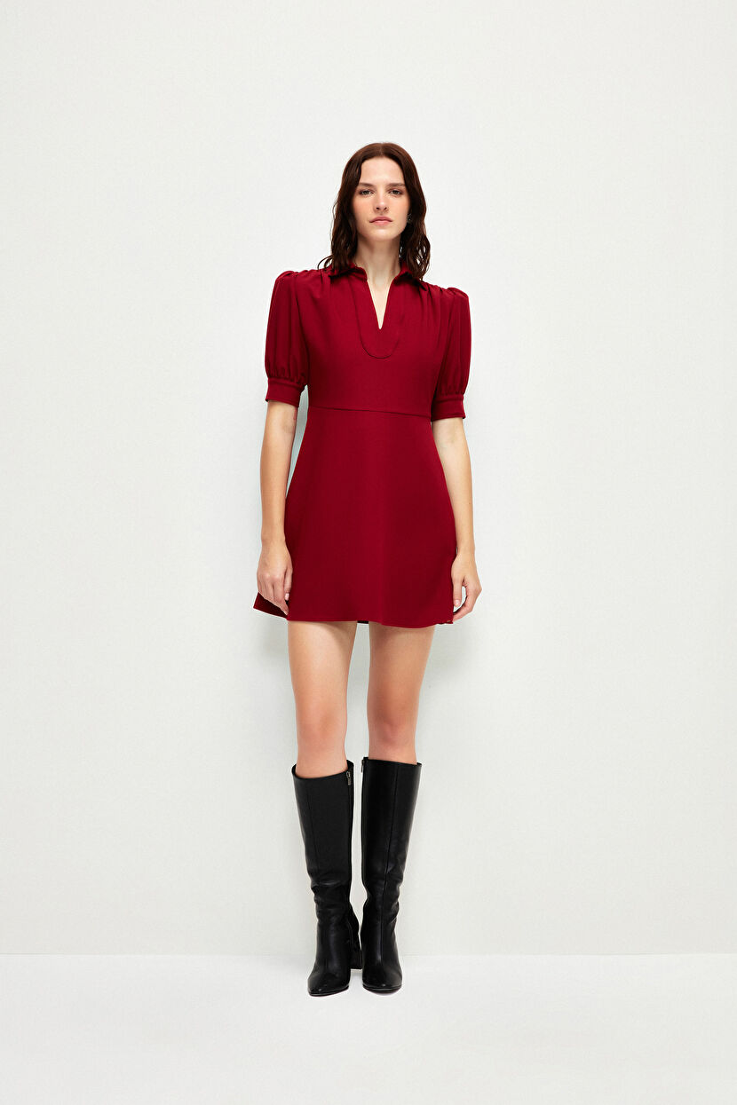 Bordo Erkek Yaka Balon Kollu Mini Elbise