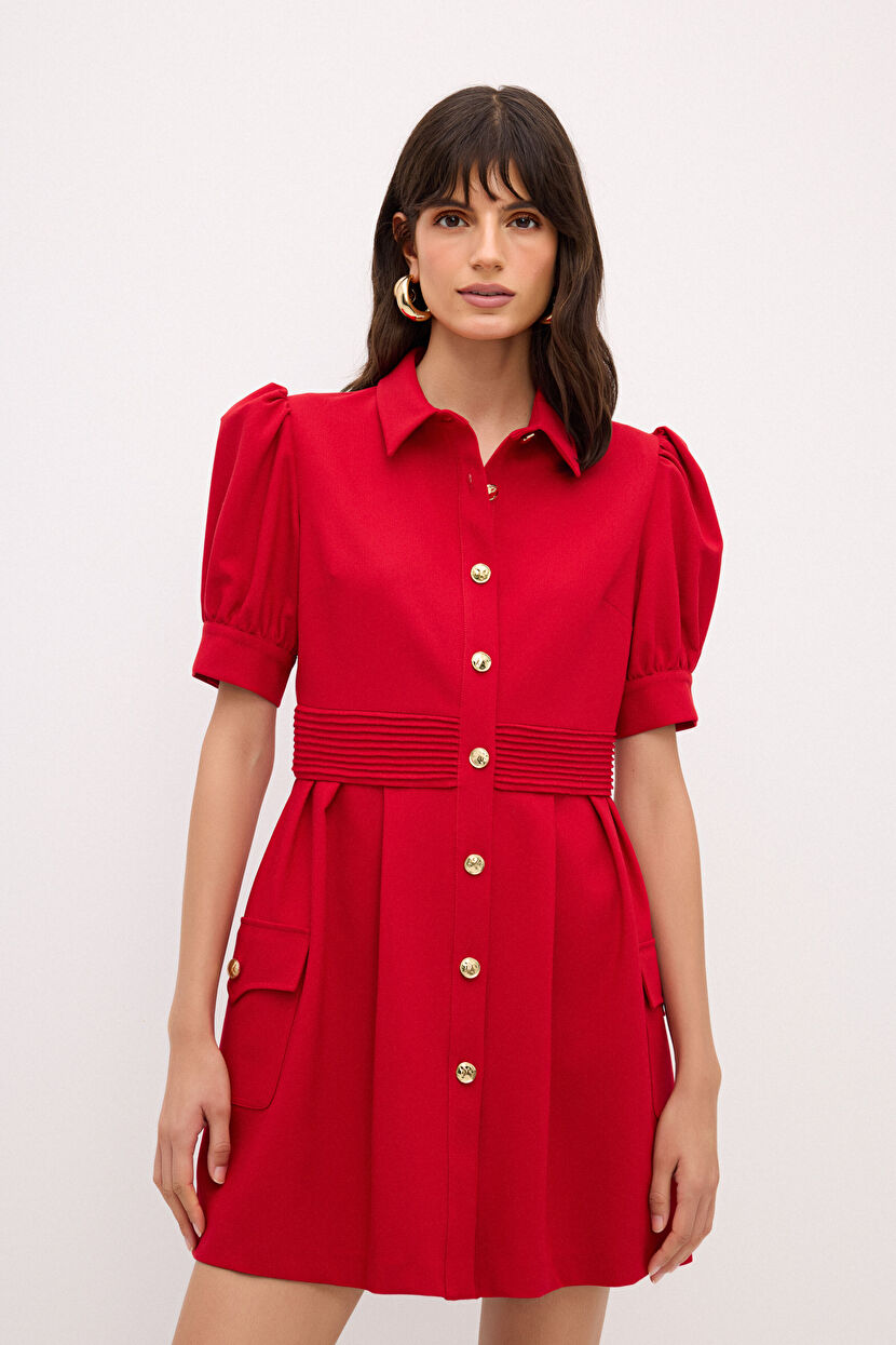 Kırmızı Balon Kollu Nervürlü Elbise