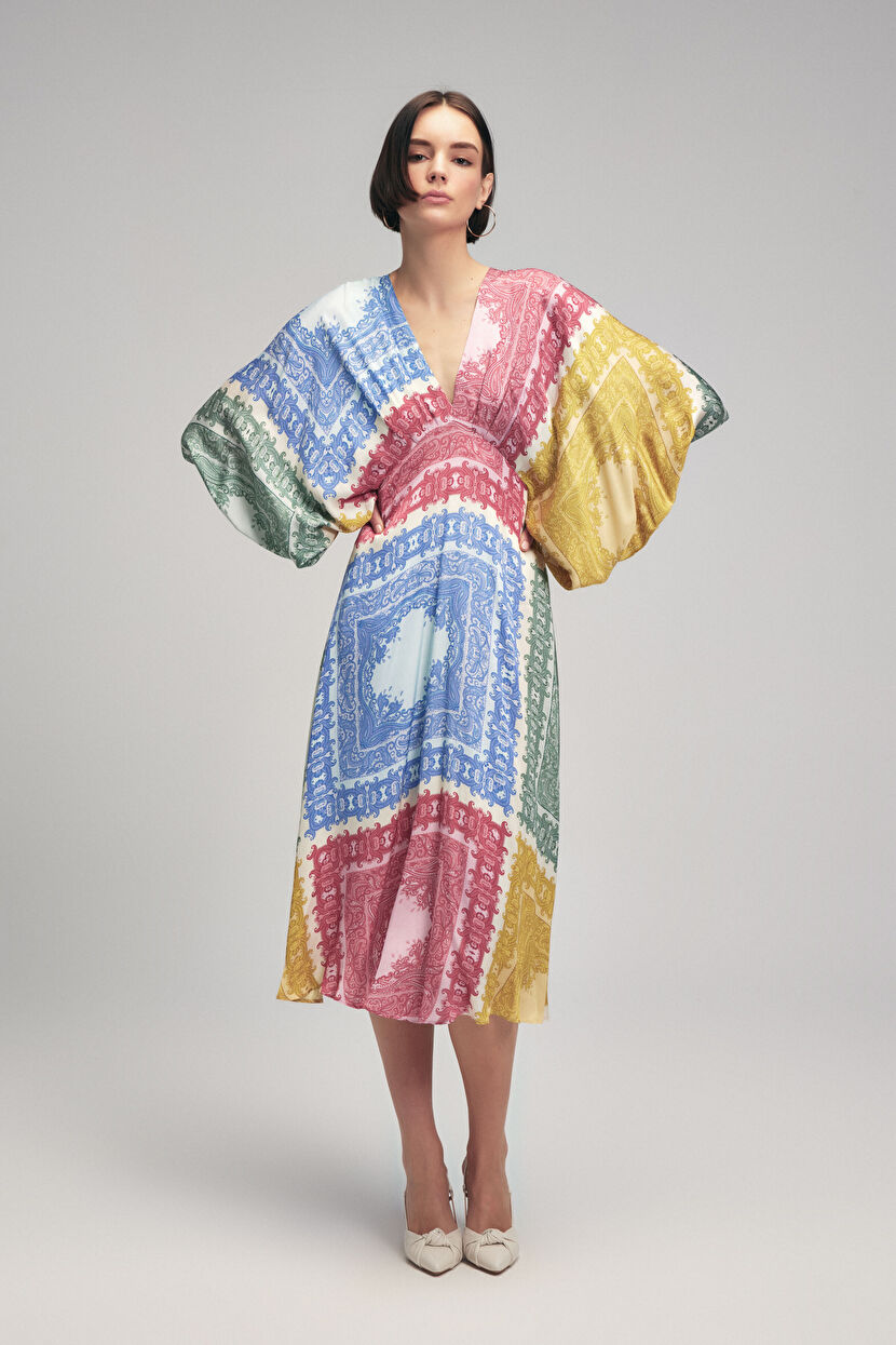Kırmızı Pileli V Yaka Desenli Elbise