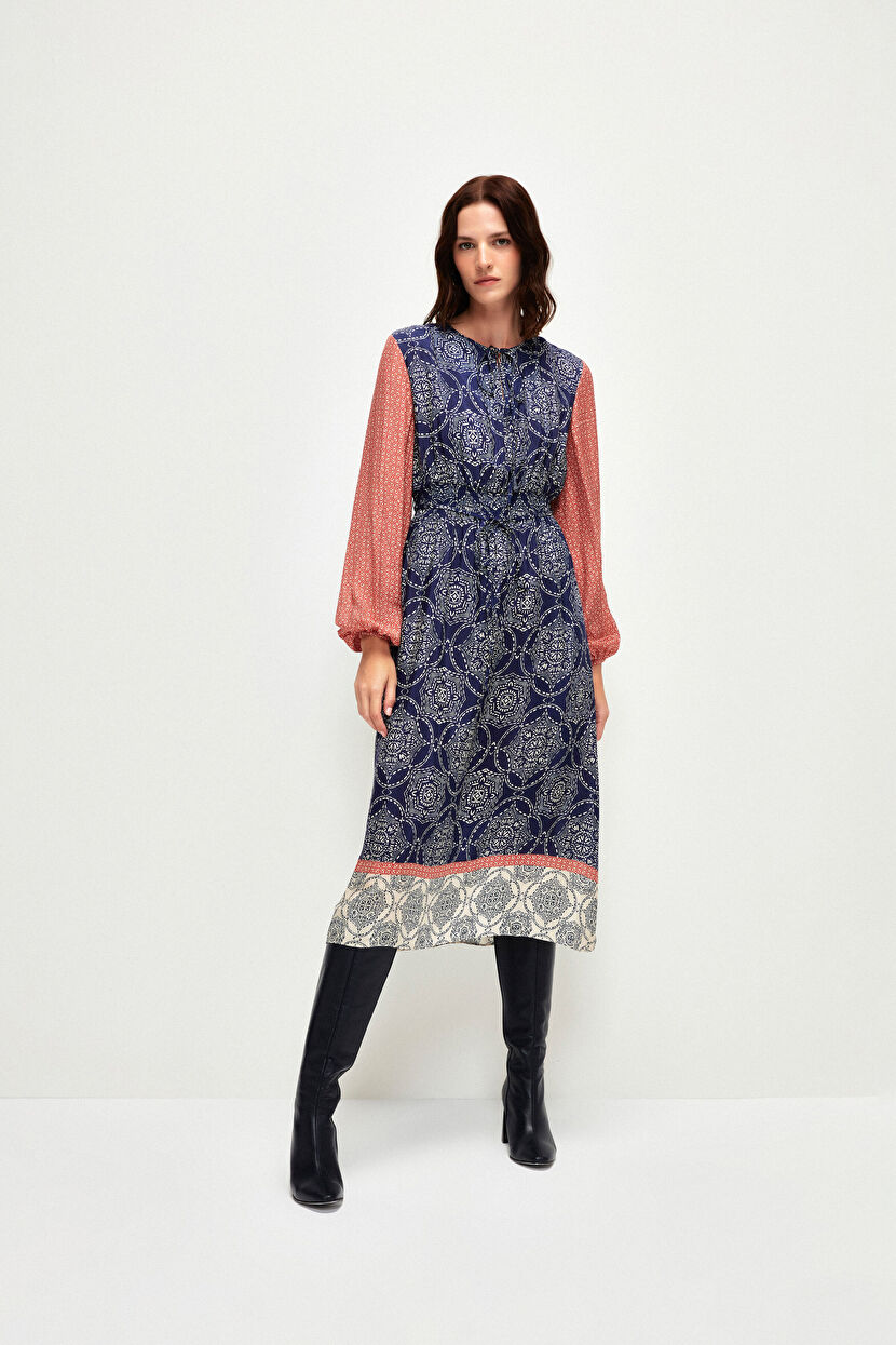 Lacivert Uzun Kollu Desenli Uzun Elbise