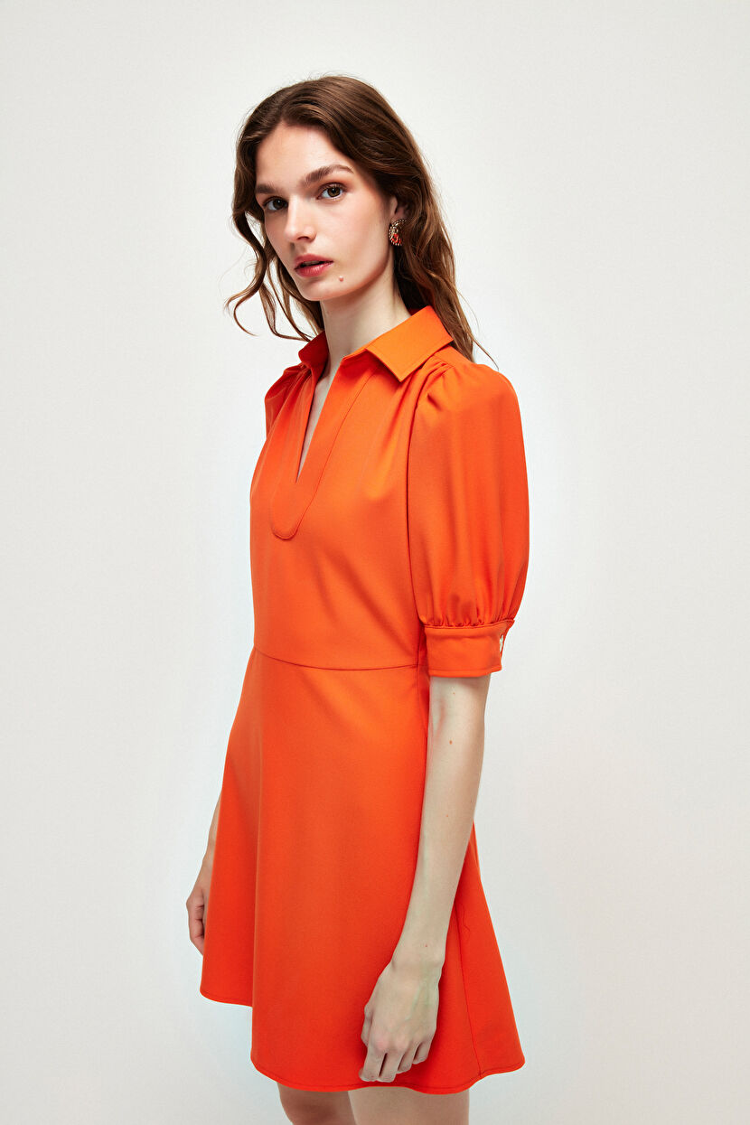 Turuncu Erkek Yaka Balon Kollu Mini Elbise