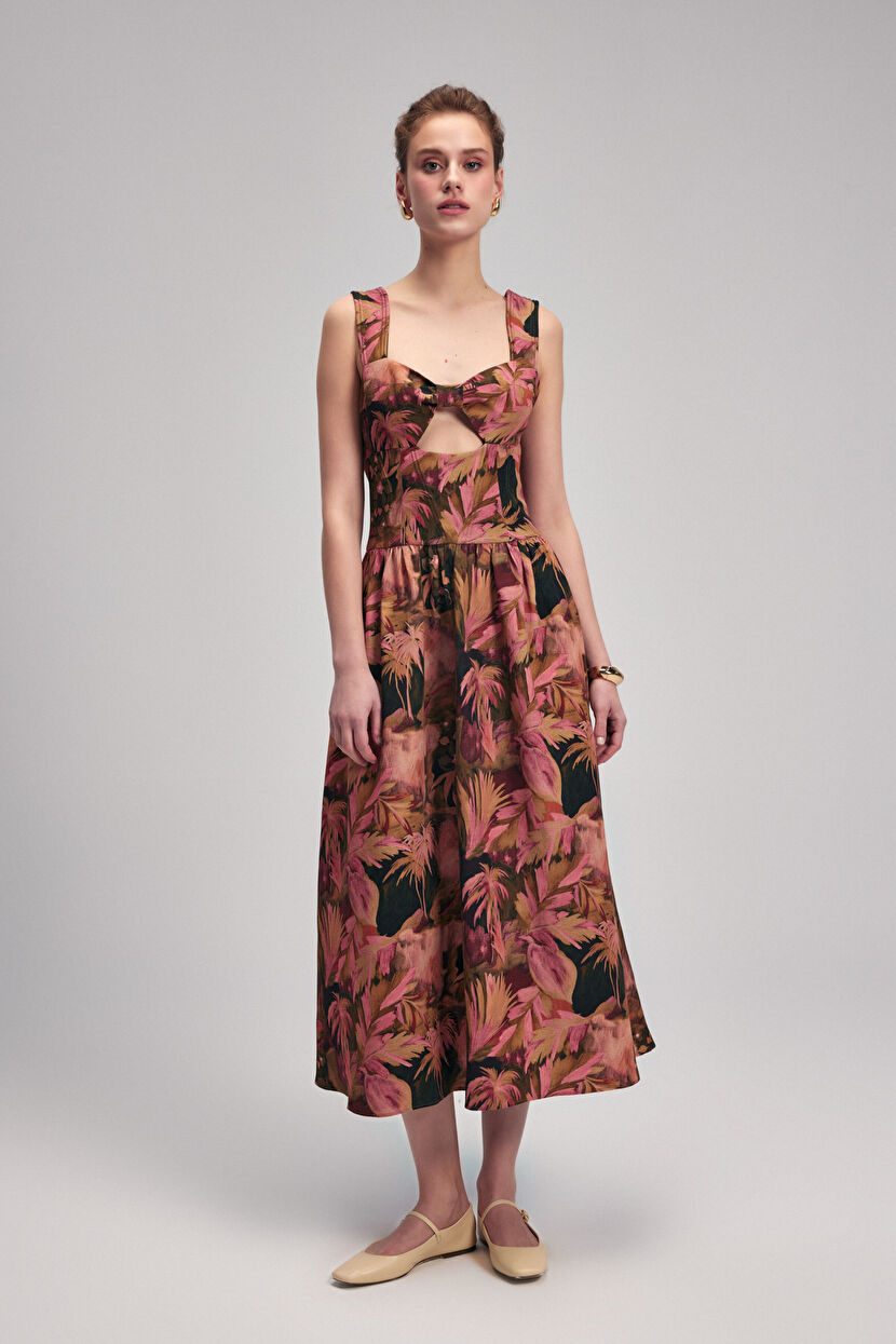 Yeşil Fiyonk Detaylı Büzgülü Desenli Elbise