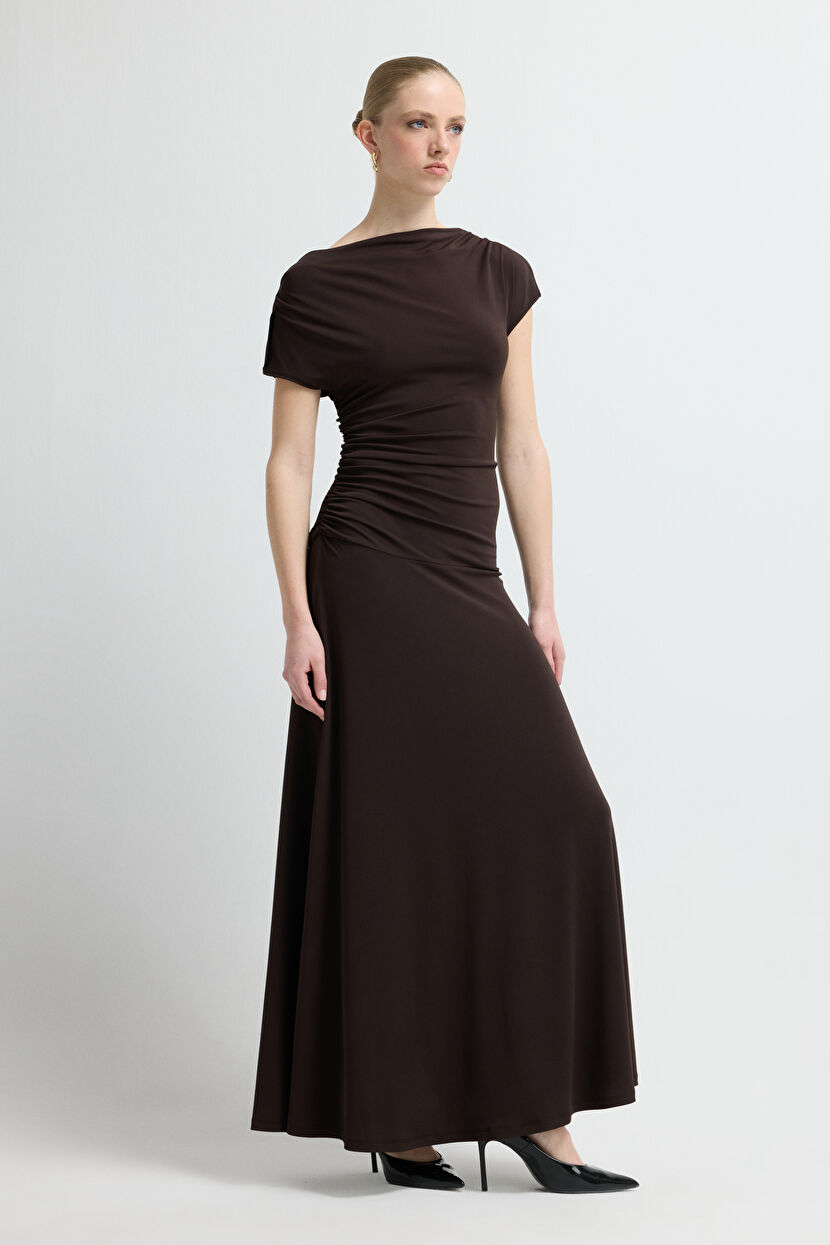 Kahverengi Büzgü Detaylı Elbise