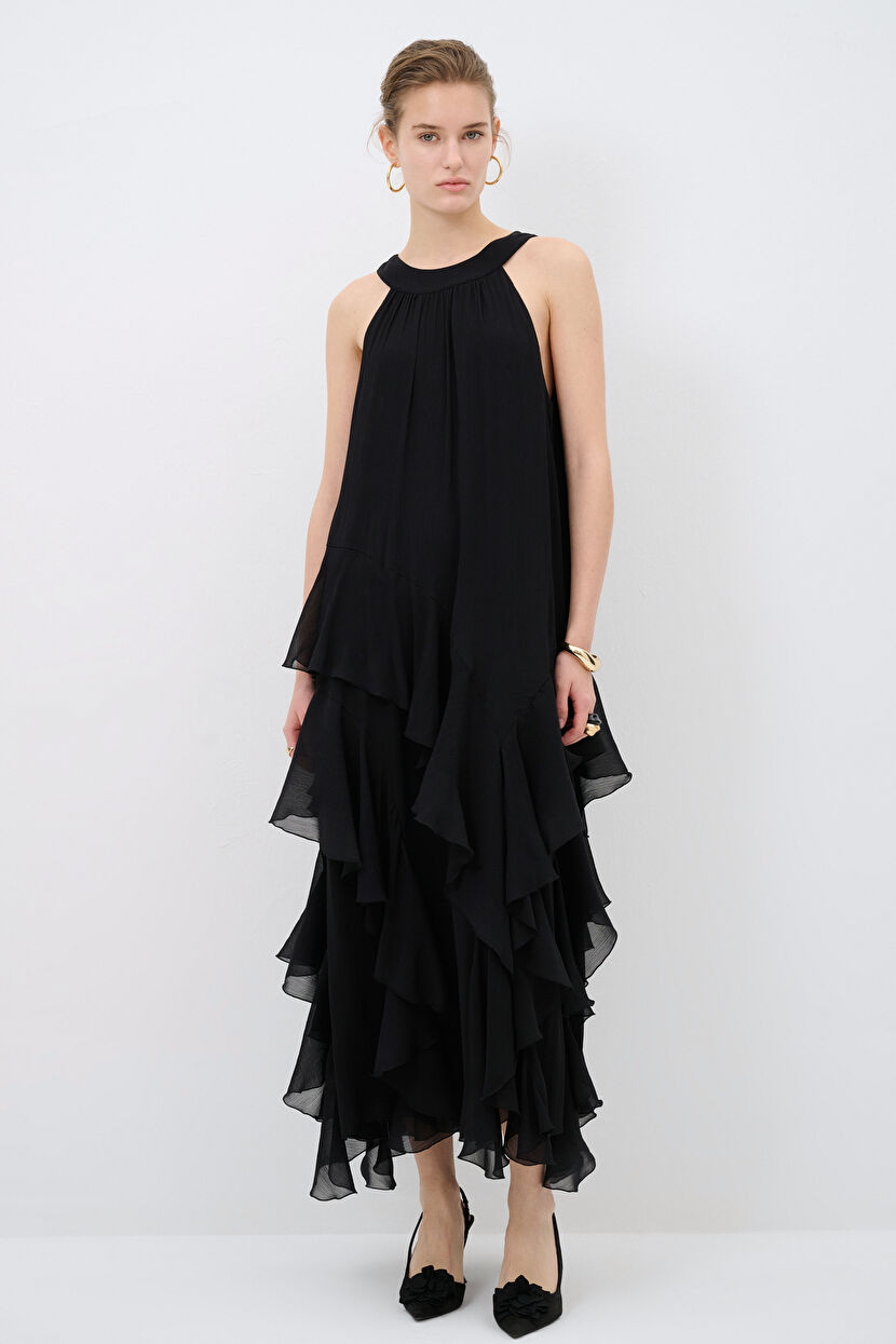 Siyah Volanlı Yırtmaç Detaylı Uzun Elbise