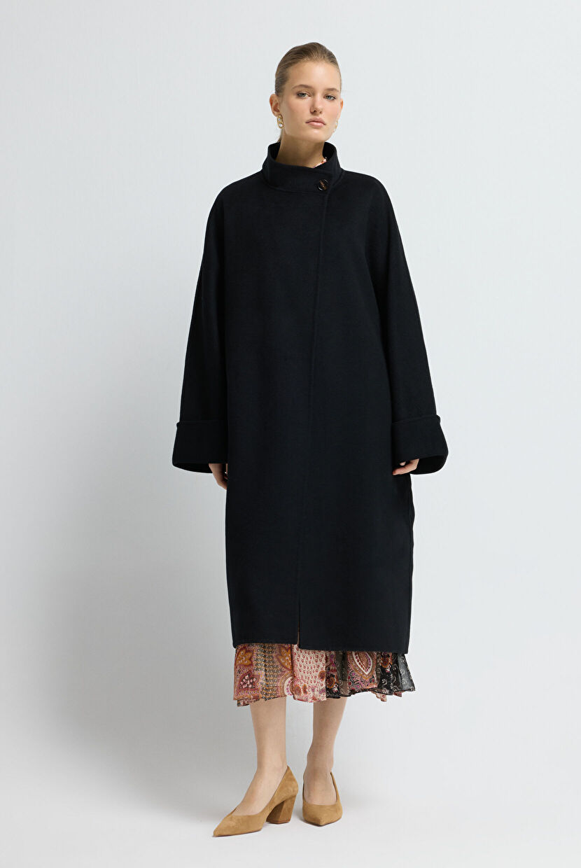 Siyah Kuşaklı Yün Karışımlı Kaban