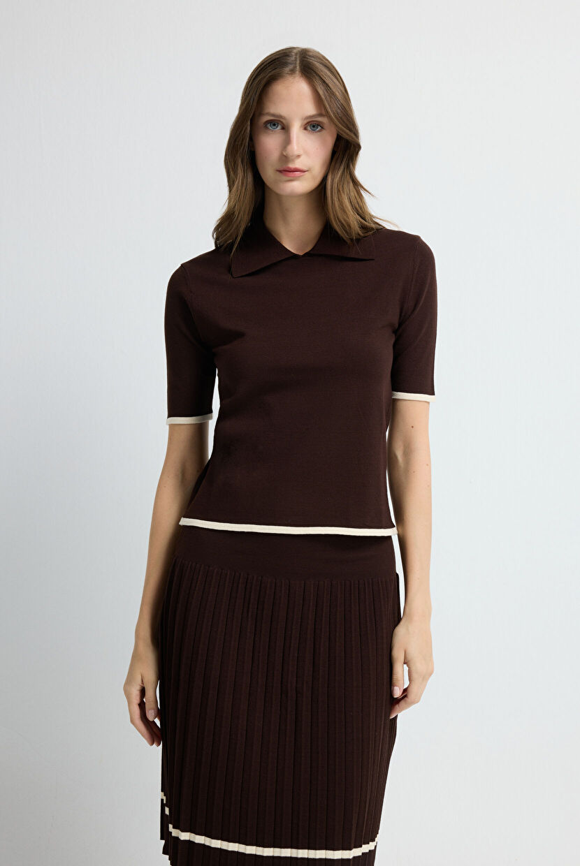 Kahverengi Dik Yaka Triko Bluz