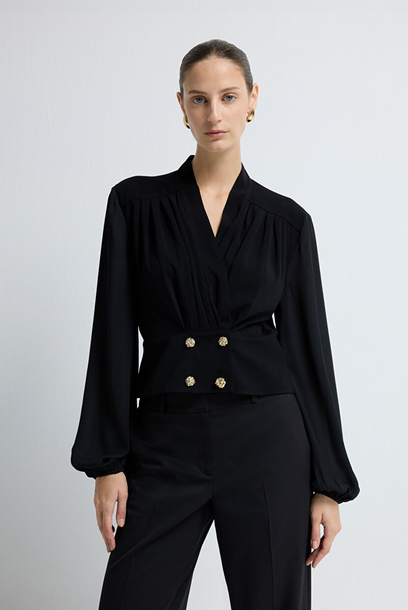Siyah Önden Düğmeli Bluz